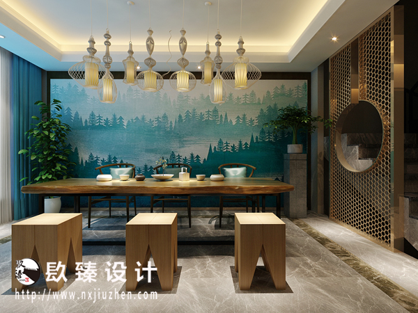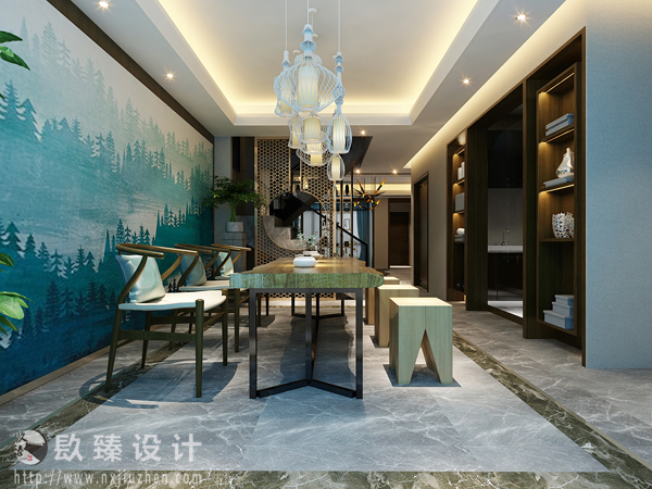 中國傳統(tǒng)的室內(nèi)陳設(shè)包括字畫、匾幅、掛屏、盆景、瓷器、古玩、屏風(fēng)、博古架等物品來體現(xiàn)出中式風(fēng)格,同時為了體現(xiàn)出室內(nèi)的現(xiàn)代感,又將中式古典的特色的裝飾物進(jìn)行現(xiàn)代風(fēng)格的再次設(shè)計,體現(xiàn)出新中式風(fēng)格設(shè)計理念。