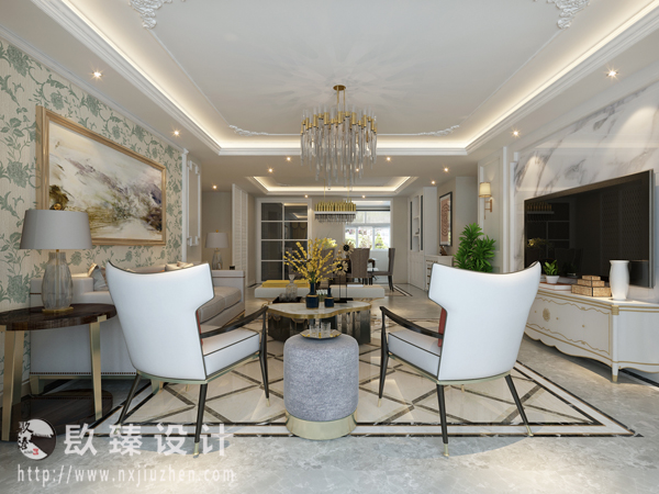 客廳色彩采用白灰為主色調(diào),打造空間的高級感。客廳采用吊燈和頂部射燈,為房間提供良好的照明。不同的光源交織在一起,打造舒適的居住體驗。