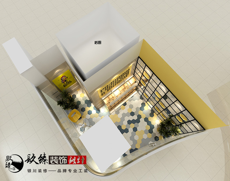 快銷(xiāo)餐飲食品店的裝修設(shè)計(jì)上,要注意色彩的運(yùn)用,銀川餐飲裝修設(shè)計(jì)|镹臻裝飾|銀川裝飾公司設(shè)計(jì)師在前期對(duì)色彩的定位上以亮色為主,因?yàn)槊娣e不大,所以靚麗的色彩會(huì)比較突出,亮黃色更顯眼一些,同時(shí)也是暖色調(diào),這樣可以增加顧客進(jìn)店消費(fèi)的幾率。地面的造型也是和墻面的多邊形互相映襯。