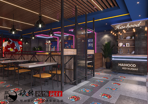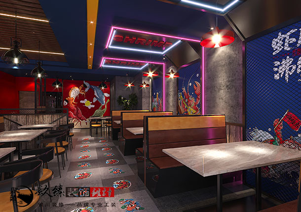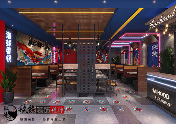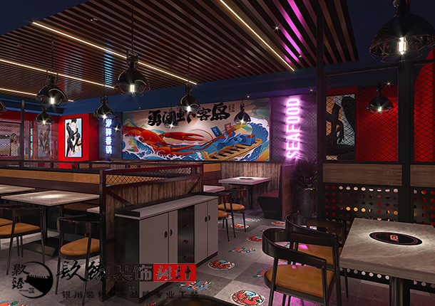 今天小編為大家重磅推薦銀川火鍋店裝修镹臻裝飾最新案例“大武口蝦哥魚妹紙包香鍋,這是一家專注于做“潮魚與美蝦“的特色餐飲,小編看到效果圖之后真的就被驚艷到了,色彩的沖擊使人看了之后內(nèi)心有一種蠢蠢欲動的感覺,還沒被美食吸引,就首先被裝修吸引進(jìn)去了。本項目位置在大武口萬達(dá)廣場,面積為120平米,銀川裝修|火鍋店裝修設(shè)計整體風(fēng)格為工業(yè)風(fēng)格,現(xiàn)在的工業(yè)風(fēng)格餐廳越來越多,但是真正能把工業(yè)風(fēng)格的美以正確的搭配展示出來的餐廳卻沒有多少,工業(yè)風(fēng)格不只是按部就班的在空間內(nèi)植入一些金屬水管等材質(zhì)那么簡單,最終要的是如何將這些風(fēng)格元素以更專業(yè)更自然的設(shè)計手法植入當(dāng)中。而設(shè)計上魯玫,就將這一點做的很好,本案例只是稍微的融合了一部分的工業(yè)風(fēng)元素,比如吊頂,軟裝的桌椅配飾、金屬隔墻、工業(yè)吊燈等等。