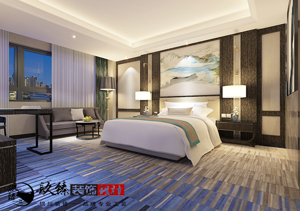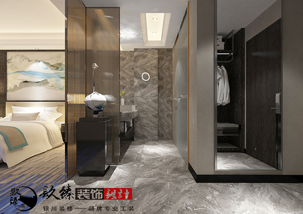 該酒店展現(xiàn)設計的大床房給人一種當代藝術感,墻面以及床頭的掛飾猶如一幅水墨畫,飄飄而來,輕輕而去。除了具有文藝氣息的裝飾畫以外,最具有現(xiàn)代感就屬地面的地毯和進門的衣帽柜了,設計師利用金屬與木頭兩種不同的材質搭配展現(xiàn)出現(xiàn)代的時尚感,一間平米不大的大床房間瞬間被銀川裝修公司銀川酒店裝修設計刻畫的高大尚了起來。