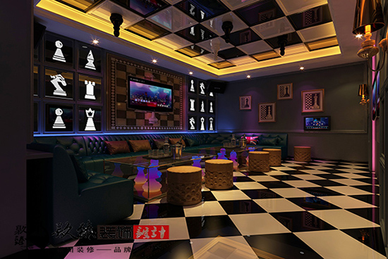 銀川裝飾公司镹臻裝飾的設(shè)計師為了達(dá)到場所的要求,大量使用暗色系的搭配,大包間頂面利用國際象棋為元素進(jìn)行吊頂?shù)难b飾,恰好和地面黑白格子的地磚相互搭配,更具對稱感,另外墻面也是用國際象棋的棋子作為點(diǎn)綴,國際象棋的形象非常的有個性,國王,騎兵等等的造型簡單而生動。