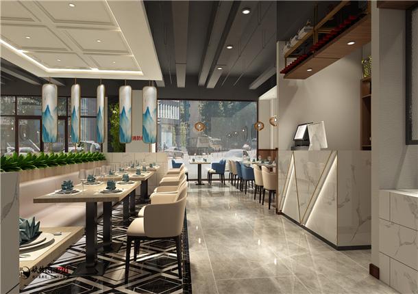餐廳色彩以素雅的黑灰為空間主色調(diào),銀川餐廳裝修|銀川餐廳裝修設(shè)計(jì)|镹臻裝飾配以金屬色貫穿及延伸整個(gè)空間,整體感受是時(shí)尚精致有細(xì)節(jié)。在用餐區(qū)的設(shè)置上以舒適的卡座為主提高用餐舒適度及私密性,明檔及廚房前置做開(kāi)放式體驗(yàn),讓顧客感受到食材的完整呈現(xiàn)。在餐廳內(nèi),隨處可見(jiàn)與輕奢系列的相關(guān)設(shè)計(jì)元素,這與餐廳的主題相得益彰。而餐廳內(nèi)的裝潢更是切中主題。本案最終將設(shè)計(jì)風(fēng)格定義為現(xiàn)代輕奢風(fēng),就是當(dāng)下非常流行的一種風(fēng)格,現(xiàn)代與輕度的奢侈相結(jié)合,屬于中高端的定位,有著自身獨(dú)特的品位。面對(duì)這日益提升的審美,將輕奢概念帶入室內(nèi)裝飾中不僅代表著精品生活方式,更代表著正在享受高質(zhì)量的生活細(xì)節(jié)。設(shè)計(jì)師運(yùn)用極致簡(jiǎn)約風(fēng)格為基礎(chǔ),再通過(guò)一些精致軟裝元素來(lái)凸顯質(zhì)感。