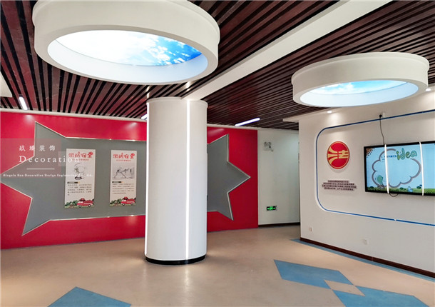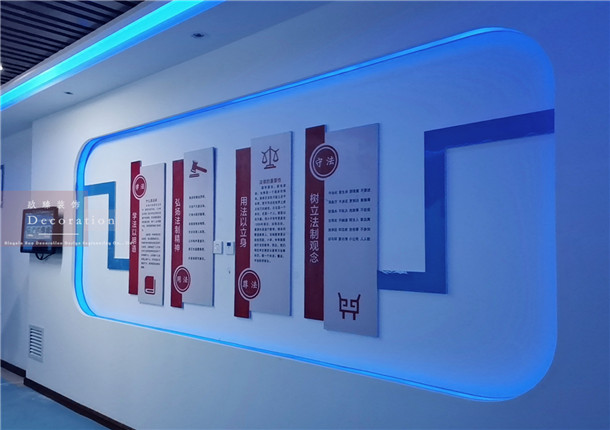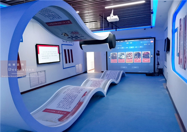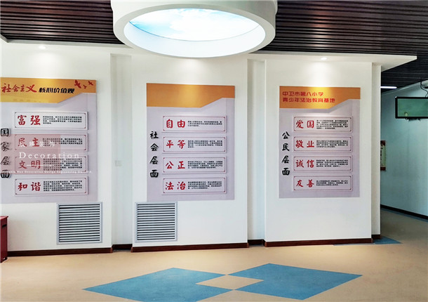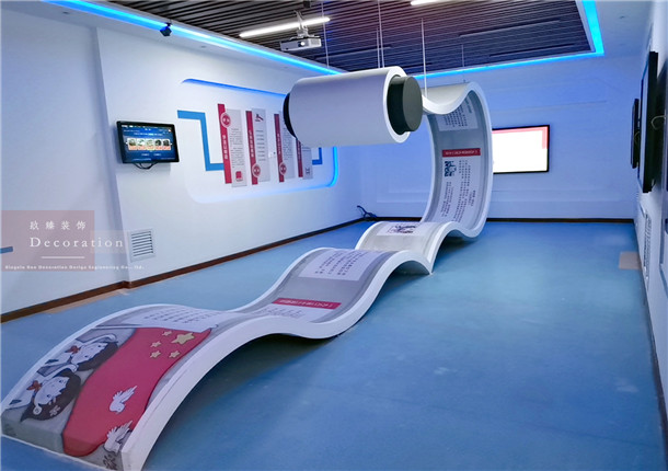 首先學(xué)校走廊宣傳欄里寫有社會(huì)主義核心價(jià)值觀的宣傳文字,培養(yǎng)學(xué)生們的精神文明是非常有必要的。消防與法治教育是兒童教育中非常重要的部分之一,所以廣告欄內(nèi)也將這兩點(diǎn)納入其中以展廳類的形式描繪出一種簡潔的展現(xiàn)。 在展廳內(nèi)部最大的亮點(diǎn)是波浪造型的設(shè)計(jì),在施工的時(shí)候是镹臻裝飾的工程總監(jiān)帶領(lǐng)專業(yè)技術(shù)工人對照施工圖細(xì)心所搭建而成,也是為了將效果更好的呈現(xiàn)。