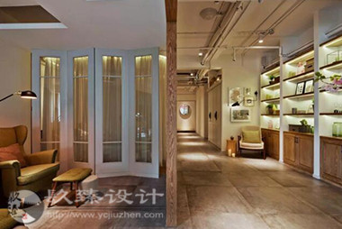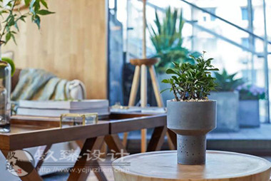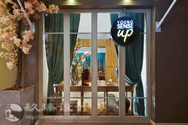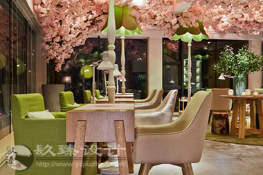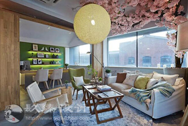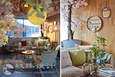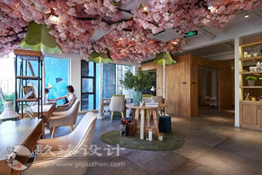 步出電梯就是櫻花樹下的櫥窗,隱約能看見窗內(nèi)的景象,推門而入是滿眼的櫻花,綠色落地?zé)舄q如撐傘在樹下賞櫻。櫻花樹枝伸到接待室的小屋頂上,透過天窗探出枝頭。