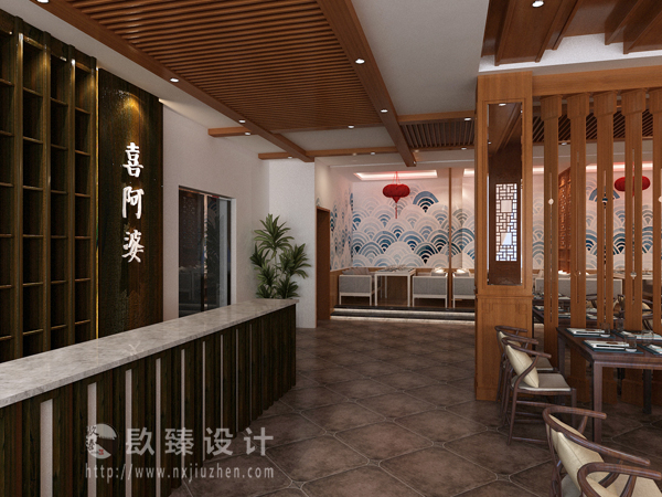 同時(shí),傳統(tǒng)的中式風(fēng)表達(dá)出了中華民族的文化底蘊(yùn),在設(shè)計(jì)時(shí)結(jié)合了現(xiàn)代化的變化和傳統(tǒng)的氣質(zhì)融合,適當(dāng)?shù)牧舭缀侠淼臓I(yíng)造出一種東方人特有的情懷,整體的餐桌以及其它木質(zhì)家具顏色選用比較沉穩(wěn)的棕色木材來(lái)裝飾,墻上的壁畫(huà)及門(mén)窗設(shè)計(jì)給中式喜阿婆粥餅店增添了不一樣的氣質(zhì)。