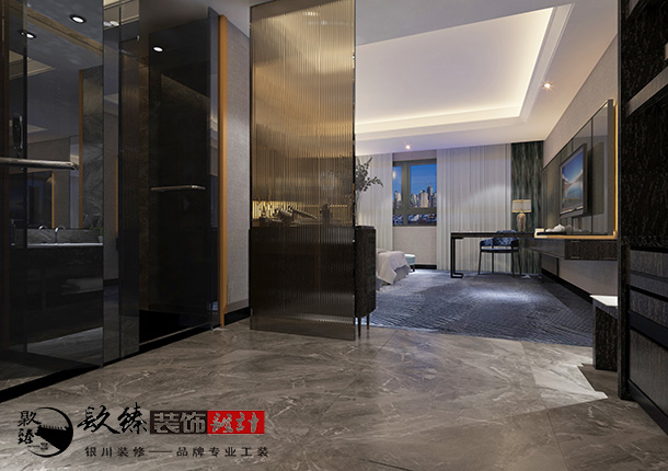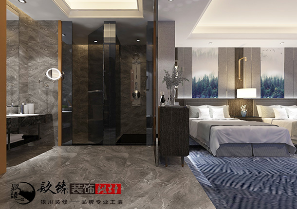 本酒店設(shè)計(jì)的標(biāo)準(zhǔn)間低調(diào)中不失奢華,衛(wèi)生間使用地磚,墻磚,金屬,玻璃等材質(zhì),會(huì)增加原本看起來比較小的空間,銀川裝修公司銀川酒店裝修設(shè)計(jì)視覺上給人一種明亮的感覺,地毯用比較復(fù)古的深藍(lán)色系,和墻面的灰色搭配起來非常的有質(zhì)感,整體空間屬于比較冷色系的感覺,純靜,安逸感油然而生。