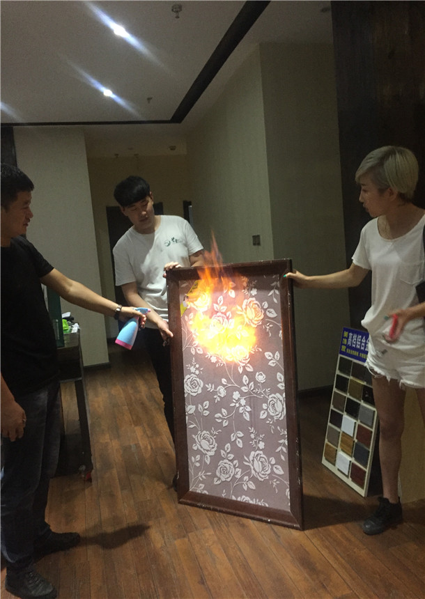 接下來(lái)高能!防火耐高溫演示:噴灑酒精后點(diǎn)火,樣品表面燃燒兩分鐘,滅火后無(wú)任何變化!